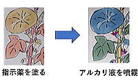 カレー粉液を染み込ませた画用紙に電気ペンで絵や文字を描く